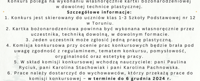 Zapraszamy do zapoznania się z informacjami o konkursie na najpiękniejszą kartkę bożonarodzeniową dla uczniów klas I-III Szkoły Podstawowej nr 12 w Toruniu. Szczegóły dostępne w zakładce Szkoła -> Konkursy